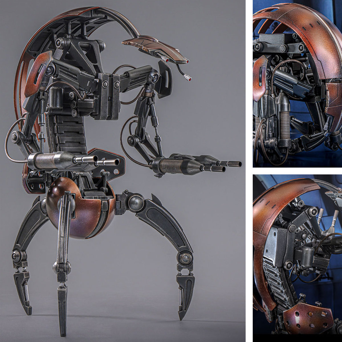 Droidekas, auch bekannt als Destroyer-Droiden, sind die furchterregenden Kampfmaschinen des Star Wars-Universums. Sie rollen sich zu Kugeln zusammen und entfalten sich dann spektakulär auf drei Beinen, bereit, ihre beiden schweren Blasterkanonen abzufeuern. Ihre starken Schilde machen sie nahezu unverwundbar gegen Blasterfeuer und körperliche Angriffe. Diese intelligenten Droiden, die von den Colicoiden entwickelt wurden, kämpften während der Klonkriege auf Seiten der Handelsföderation und der Separatisten. Ihre blitzschnelle Beweglichkeit und ihre starken defensiven Fähigkeiten machen sie zu gefürchteten Gegnern. Ihr Debüt gaben sie in "Star Wars: Episode I - Die dunkle Bedrohung" ("Star Wars: Episode I - The Phantom Menace", 1999, Regie: George Lucas), wo sie sich eindrucksvoll gegen die Jedi Qui-Gon Jinn und Obi-Wan Kenobi zur Wehr setzten. Wir bieten hier eine hochwertige und aufwendige 1/6 Figur eines solchen Droidekas vom Hersteller Hot Toys. Mit über 25 Gelenken ist die Figur voll beweglich und kann in allen ikonischen Posen aus den Filmen aufgestellt werden. Die Metallic-Lackierung mit Verwitterungseffekten sorgt für ein authentisches Aussehen. Das Ganze kommt in einer eleganten Sammlerbox - ein Muss für jeden Star Wars-Fan!
