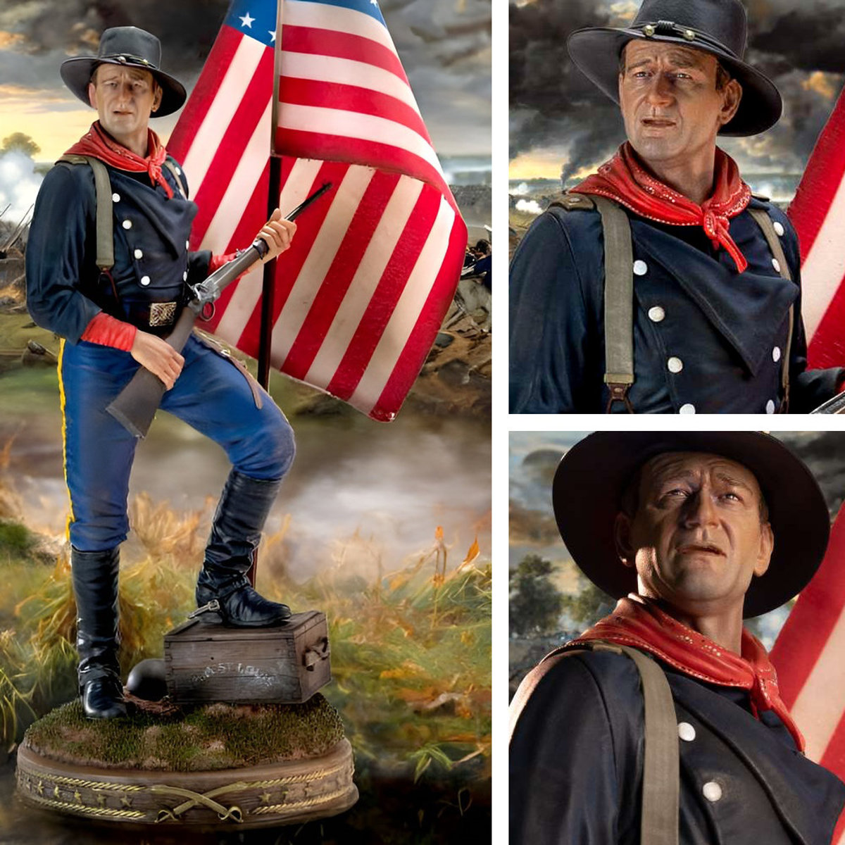 Der Film "The Horse Soldiers" ("Der letzte Befehl", 1959, Regie: John Ford) ist ein Bürgerkriegsdrama mit John Wayne in der Rolle des Colonel John Marlowe. Marlowe führt eine Kavallerieeinheit der Union tief in den Süden, um eine wichtige Eisenbahnlinie der Konföderierten zu zerstören. Auf ihrer gefährlichen Mission werden sie von der resoluten Südstaatlerin Hannah Hunter (Constance Towers) begleitet, was zu Spannungen und einer sich entwickelnden Beziehung führt. Major Henry Kendall (William Holden), der Arzt der Einheit, stellt Marlowes militärische Ansichten in Frage, was zu moralischen und ethischen Konflikten führt. Der Film endet dramatisch mit der Flucht der Einheit, die die Härte des Krieges verdeutlicht. John Wayne überzeugt als entschlossener und vielschichtiger Anführer. Wir bieten hier eine hochwertige Statue von John Wayne als Colonel John Marlowe. Die Statue ist aus Kunstharz gefertigt und im Maßstab 1/6 (mit Fahne ca. 48 cm hoch). Das Künstlerteam von Infinite Statue hat den Heldenmut und die Entschlossenheit von John Wayne bis ins kleinste Detail eingefangen. Vom Gesicht über die originalgetreue Nachbildung der Kleidung bis hin zum verzierten Sockel wurde jedes Detail sorgfältig gestaltet, um Realismus und Dynamik zu erzeugen. Die John Wayne Civil War 1863 Statue ist ein echtes Highlight für Fans des Duke und Liebhaber des großen Kinos. Verpackt ist das limitierte Sammlerstück in einer wunderschön gestalteten Box.